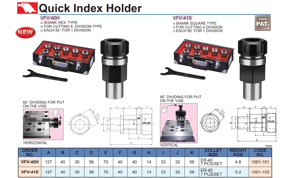 – Bầu kẹp chia độ nhanh VFV-40H của VERTEX có chuôi bầu kẹp hình lục phương. Cho phân độ tối đa 6 phần bằng nhau, mỗi góc chia là 60°.