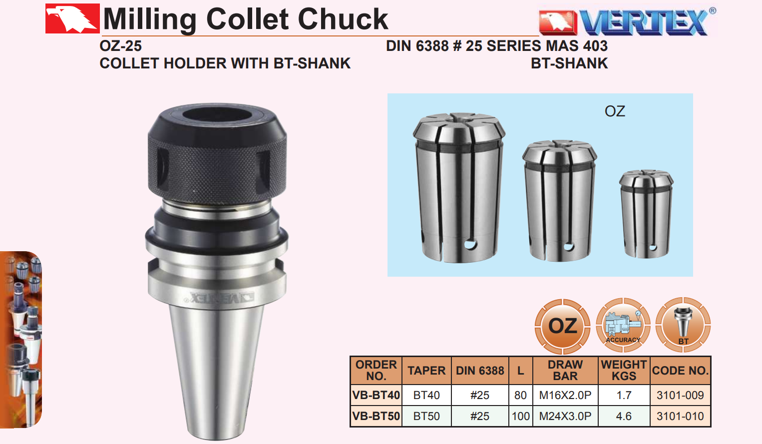 – Collet OZ-25 theo tiêu chuẩn DIN 6388 (xem sản phẩm Collet OZ).