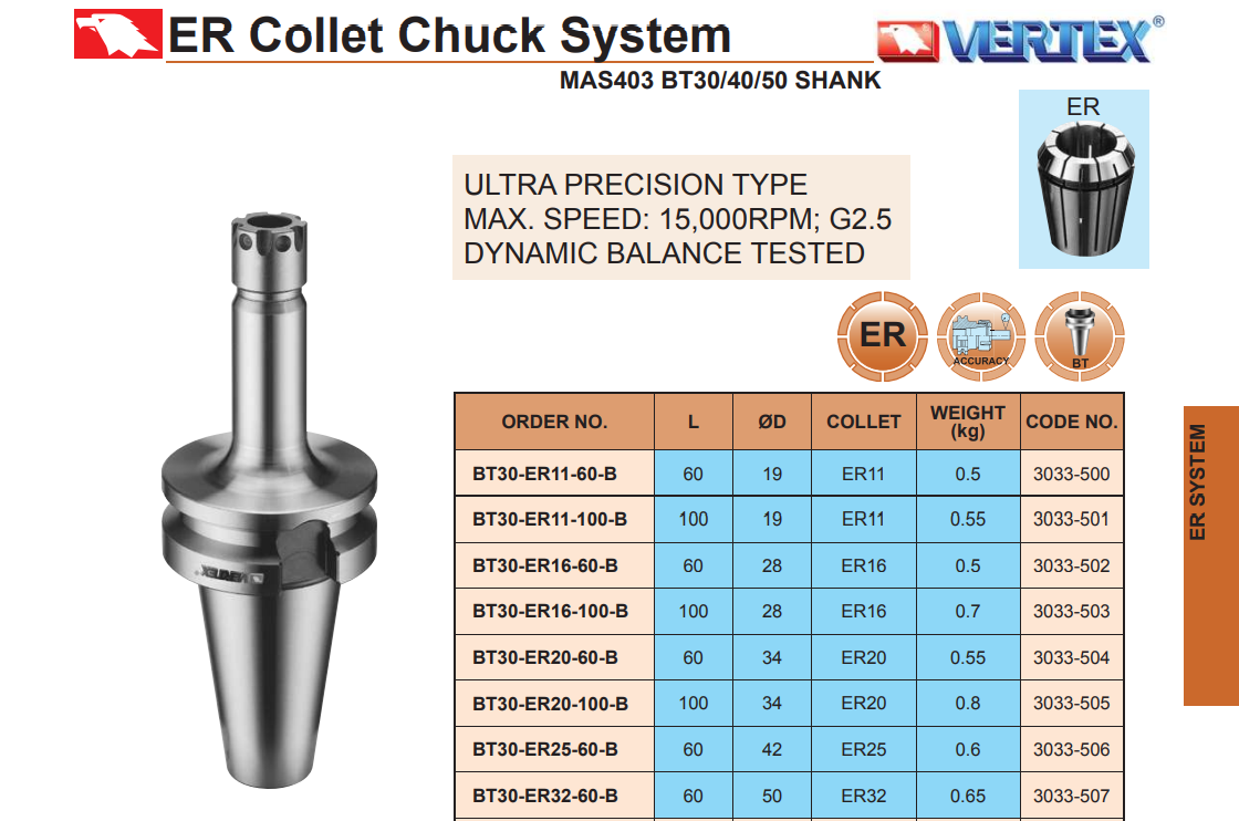 Bầu kẹp dao phay chính xác kiểu BT mã gồm BT-30-ER11-60-B, BT30-ER11-100-B, BT30-ER16-60-B, BT30-ER16-100-B, BT30-ER20-60-B, BT30-ER20-100-B, BT30-ER25-60-B, BT30-ER32-60-B, BT40-ER11-70-B, BT40-ER11-100-B, BT40-ER16-70-B, BT40-ER16-100-B, BT40-ER20-70-B, BT40-ER20-100-B, BT40-ER25-70-B, BT40-ER25-100-B, BT40-ER32-70-B, BT40-ER32-100-B, BT30-ER11M-100-B, BT30-ER16M-100-B, BT30-ER20M-100-B, BT40-ER11M-100-B, BT40-ER16M-100-B, BT40-ER20M-100-B