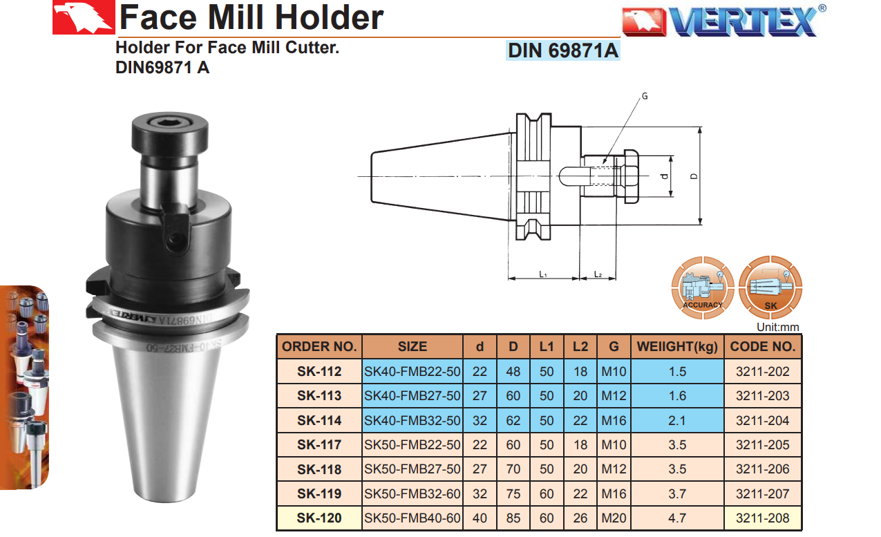 + Bầu kẹp dao phay khỏa mặt kiểu SK Vertex dùng để kẹp đài dao phay khỏa mặt.