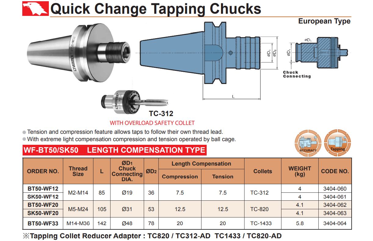 – Bầu kẹp được lắp với các collet kẹp ta rô thay nhanh theo 3 tiêu chuẩn của Châu Âu là: TC-312 (M2 – M14); TC-820 (M5 – M24); và TC-1433 (M14 – M36).