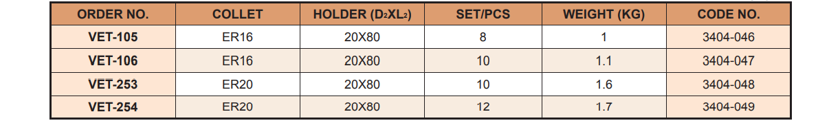 – Bầu kẹp ta rô kiểu collet ER VET-271, VET-272, VET-273, VET-274, VET-260, VET-261, VET-102, VET-202, VET-252, VET-303, VET-105, VET-106, VET-253, VET-254