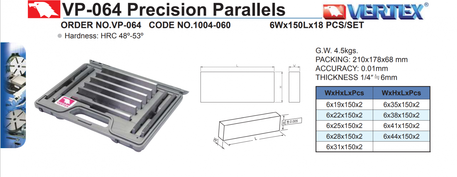 – Khối lượng toàn bộ căn đệm chính xác VP-064 là 4.5 Kg. Kích thước đóng gói: 288*228*75mm.