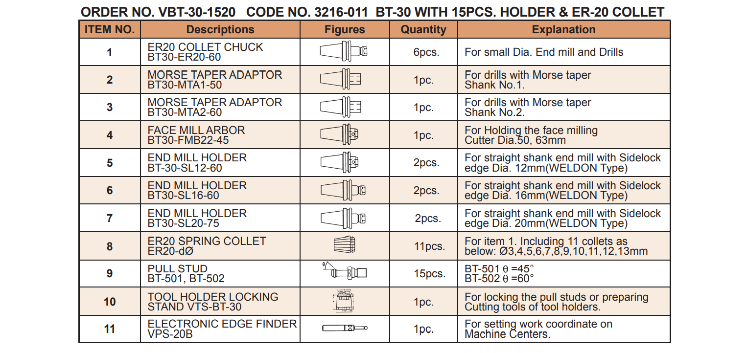 – Bộ gá kẹp dao đầy đủ cho máy phay NC VBT-30-0720, VBT-30-1520, VBT-40-1532, VBT-40-2432 của VERTEX dùng gá kẹp dao trên máy phay NC kiểu côn BT30, BT40.