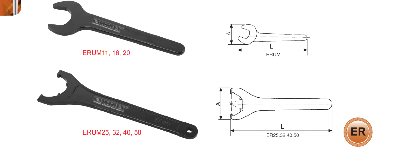 – Chìa vặn bầu kẹp collet ER8, ER11, ER16, ER20, ER25, ER32, ER40, ER50: V-820, V-821, V-822, V-823, V-815, V-824, V-811, V-812, V-813, V-814, V-817, V-818, V-825, V-826, V-827, V-828 của VERTEX dùng tháo kẹp bầu kẹp collet ER8, ER11, ER16, ER20, ER25, ER32, ER40, ER50 để tháo kẹp dao phay, mũi khoan,… trên máy phay, máy khoan cơ khí.
