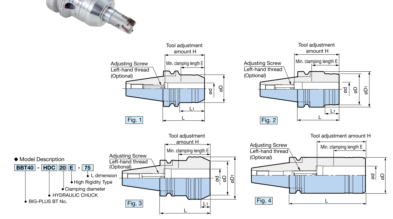 | BBT SHANK Model | Fig. | φd | φD | ΦD1 | L | L1 | H | E | Adjusting Screw(Optional) |