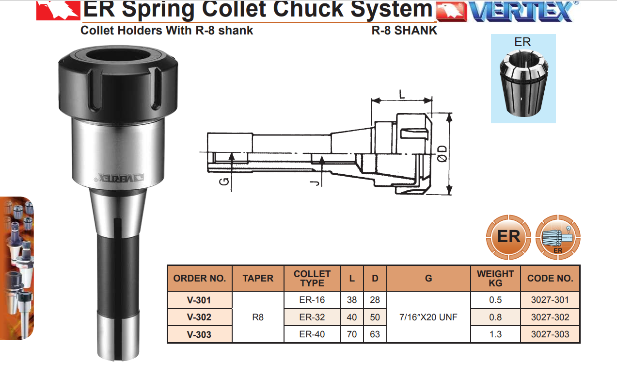 – Collet ER16, ER32, ER40 theo tiêu chuẩn DIN 6499 (xem sản phẩm Collet ER).