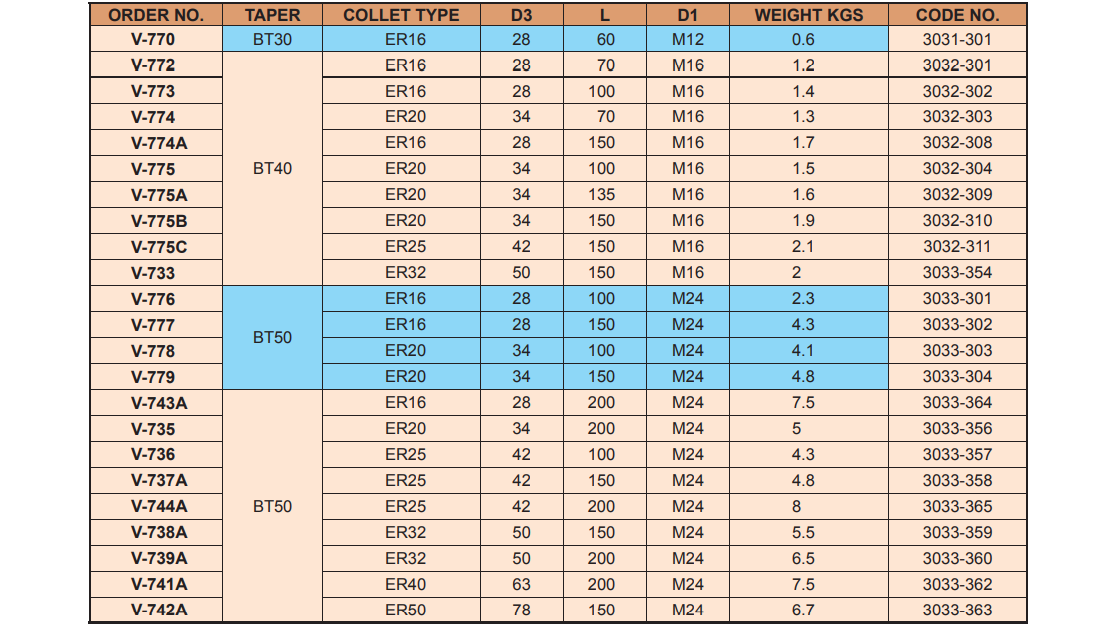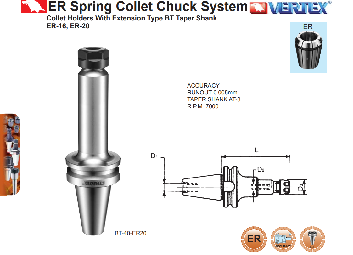 ĐẦU KẸP VERTEX KIỂU BT COLLET ER V-770, V-772, V-773, V-774, V-774A, V-775, V-775A, V-775B, V-775C, V-733, V-776, V-777, V-778, V-779, V-743A, V-735, V-736, V-737A, V-744A, V-738A, V-739A, V-740A, V-741A, V-742A được nhập khẩu trực tiếp về Việt Nam, Kiểu dáng đầu kẹp BT này có nhiều size khác nhau giúp bạn lựa chọn phù hợp với nhu cầu sử dụng dễ dàng hơn.
