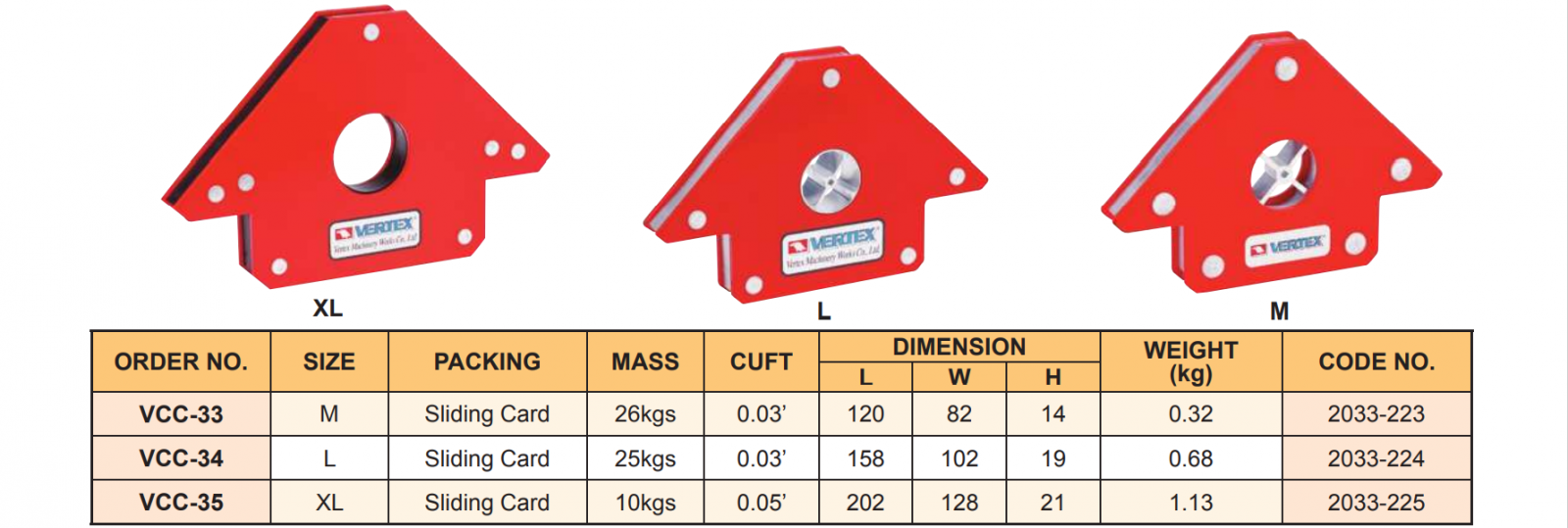 – Đế kẹp từ nam châm VCC-30, VCC-31, VCC-33, VCC-34 của VERTEX dùng kẹp cố định các chi tiết với nhau bằng lực hút từ trước khi hàn, lắp ghép.