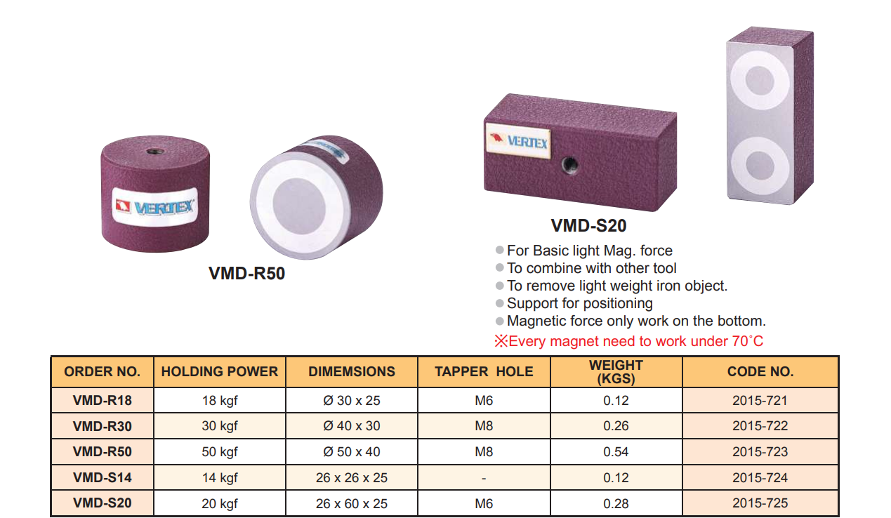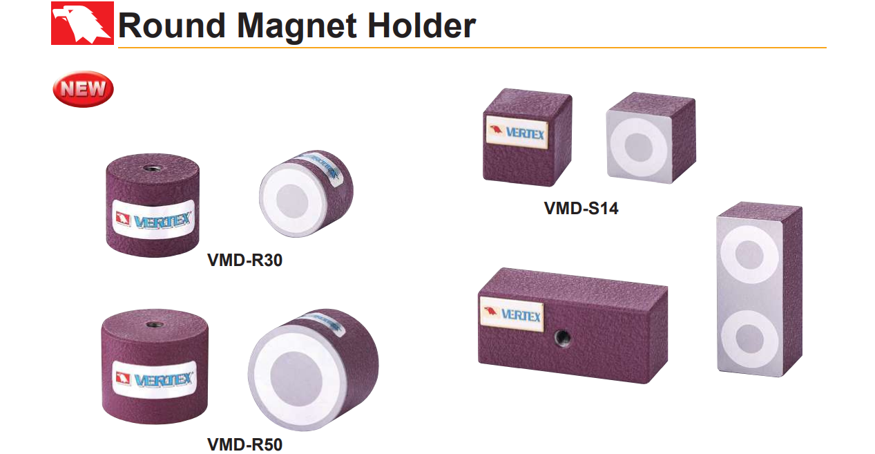 – Đế từ nam châm tròn vuông VMD-R18, VMD-R30, VMD-R50, VMD-S14, VMD-S20 của VERTEX có lực hút từ nhẹ, sử dụng cùng các chi tiết khác làm các kết cấu, thiết bị.