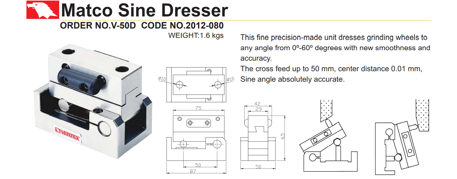 – Đồ gá sửa đá mài nghiêng VP-50, V-50D của VERTEX được sử dụng để sửa biên dạng vát thẳng của đá mài.