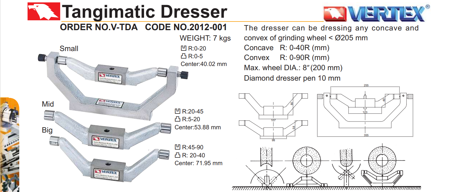 – Đường kính đá mài lớn nhất mà đồ gá sửa đá mài VERTEX sửa được là: F205mm.