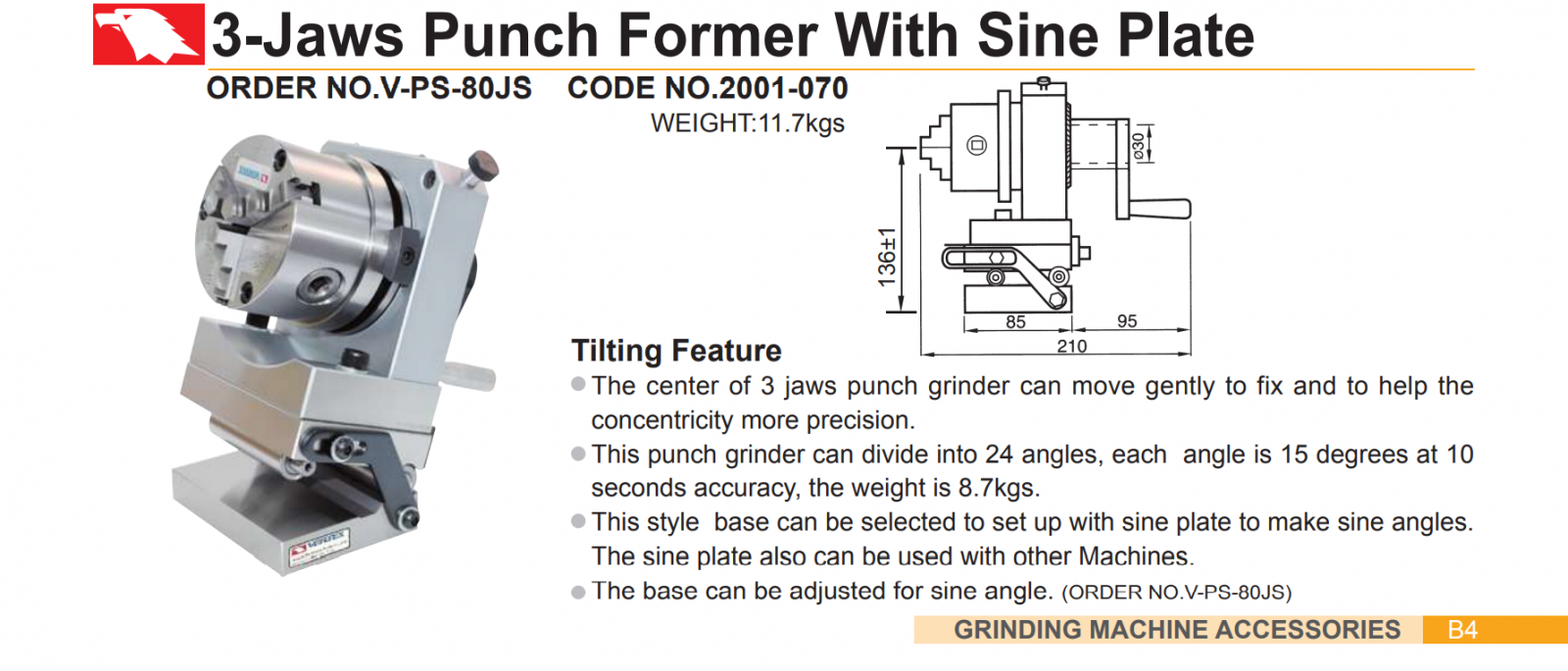 Dụng cụ sửa đá collet bàn nghiêng Vertex V-PS-80JS được đặt trên bàn từ nghiêng và dùng collet để gá kẹp các mũi sửa đá và sửa đá mài theo các biên dạng khác nhau theo yêu cầu sử dụng