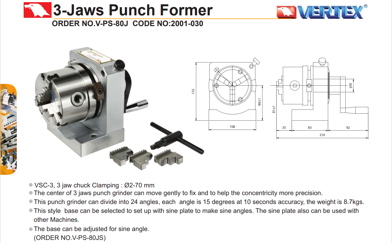 Dụng cụ sửa đá Vertex V-PS-80J dùng mâm cặp để gá kẹp các mũi sửa đá và sửa đá mài theo các biên dạng khác nhau theo yêu cầu sử dụng