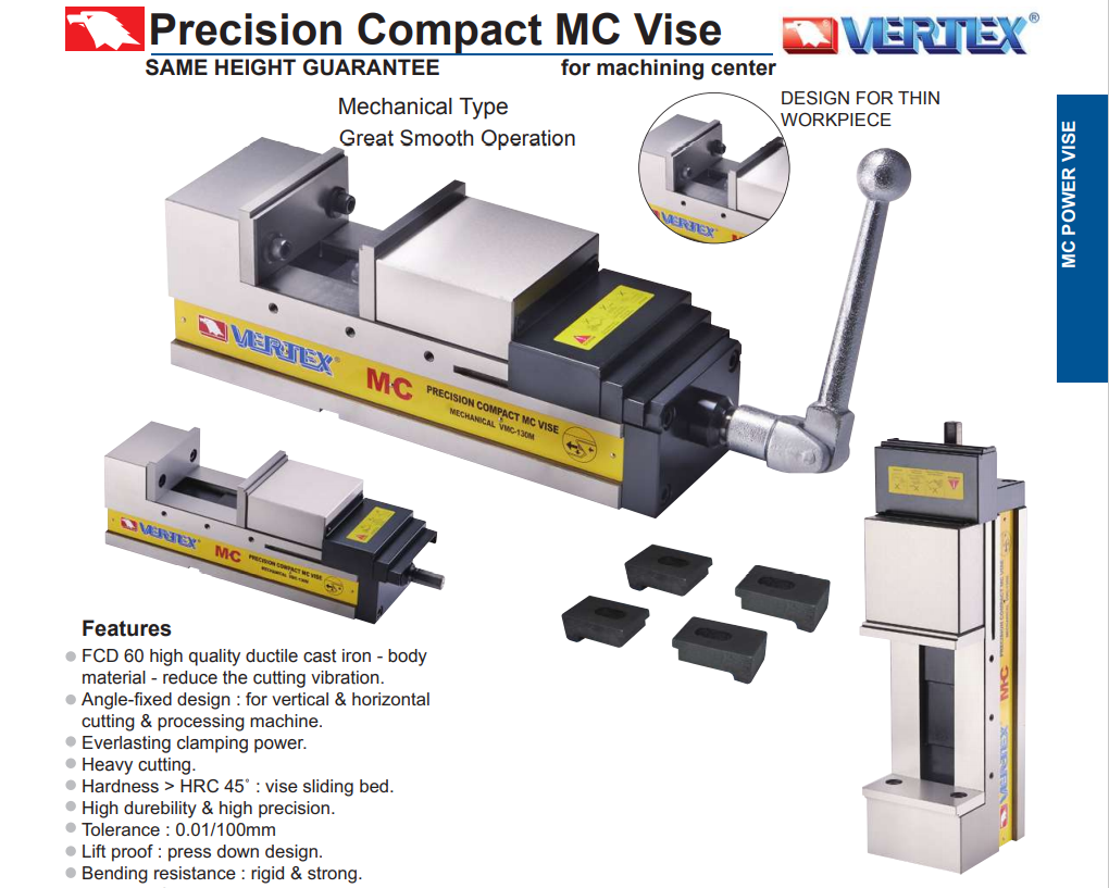• Ê TÔ CƯỜNG LỰC CHÍNH XÁC mã VMC-100M, VMC-130M, VMC-160M, VMC-200M được hãng Vertex sản xuất với chất lượng cao, ê tô này được dùng nhiều trên các loại máy phay CNC, NC và một số loại máy gia công cơ khí khác, với những ưu điểm nổi bật với hệt thống cường lực cho phép kẹp chặt chắc chắn ổn định trong quá trình gia công.