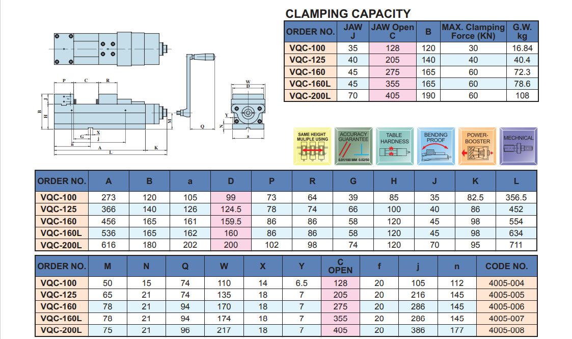 – Ê tô cường lực VQC- cho lực kẹp phôi chính xác từ: 600 Kgf – 6000 Kgf (Xem bảng lực kẹp với từng ê tô).