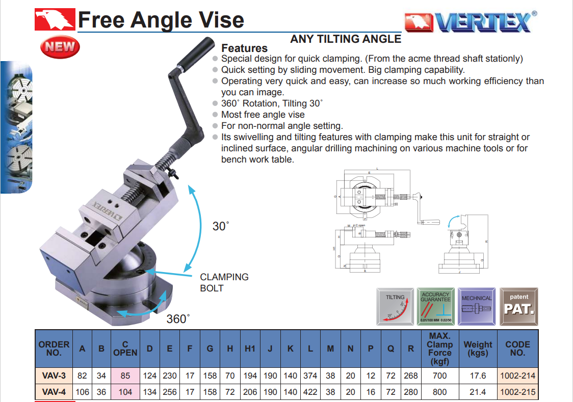 – Ê tô kẹp nhanh xoay nghiêng VAV của Vertex thích hợp cho khoan bề mặt phẳng hoặc nghiêng trên các máy công cụ.