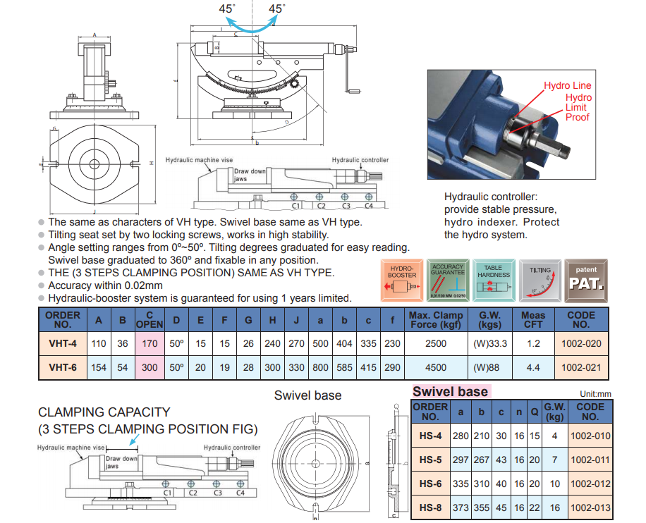 • Thân ê tô thủy lực VHT này về cơ bản được cấu tạo giống với loại Ê tô thủy lực VH, chỉ khác ở chỗ là phần đế ê tô có thể nghiêng theo phướng đứng 0˚~ 50˚ và có thể xoay 360o giúp bạn có thể điều chỉnh góc nghiêng chính xác ở bất kỳ góc độ nào mà bạn cần.