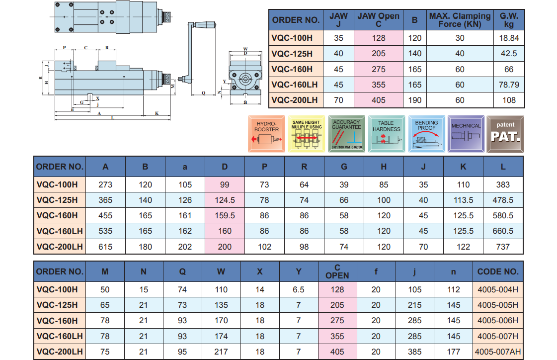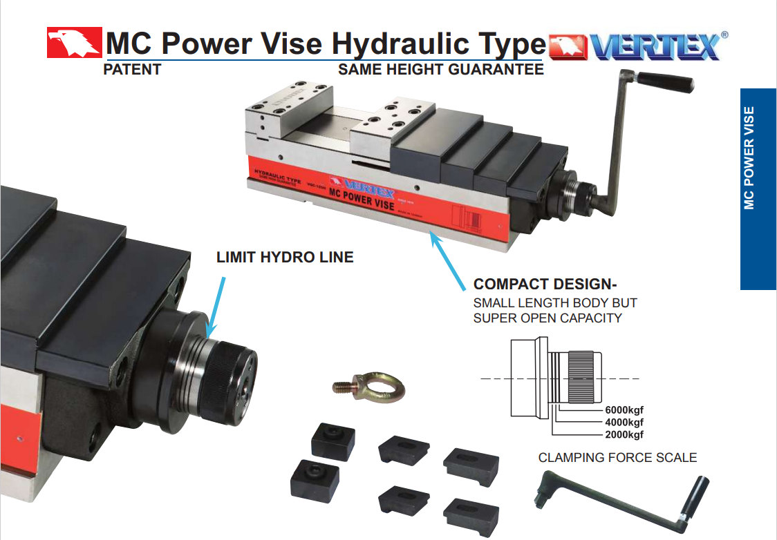 – Ê tô thủy lực VQC-H của VERTEX sử dụng cho máy phay, khoan, trung tâm gia công, máy mài và nhiều máy khác.