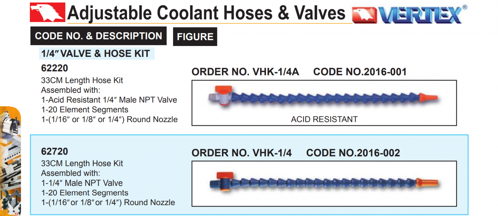 – Hệ thống vòi tưới nguội: van, đầu tưới, khớp nối ¼”, 3/8”, ½”, ¾” của VERTEX dùng dẫn dung dịch tưới nguội, dầu làm mát vào khu vực gia công.