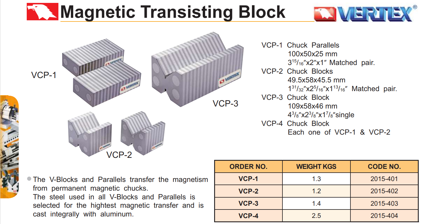– Khối truyền từ tính VCP-0, VCP-1, VCP-2, VCP-3, VCP-4, VCP-6 của VERTEX được sử dụng để truyền từ tính từ bàn từ nam châm vĩnh cửu khi kẹp chi tiết có hình dạng phức tạp.