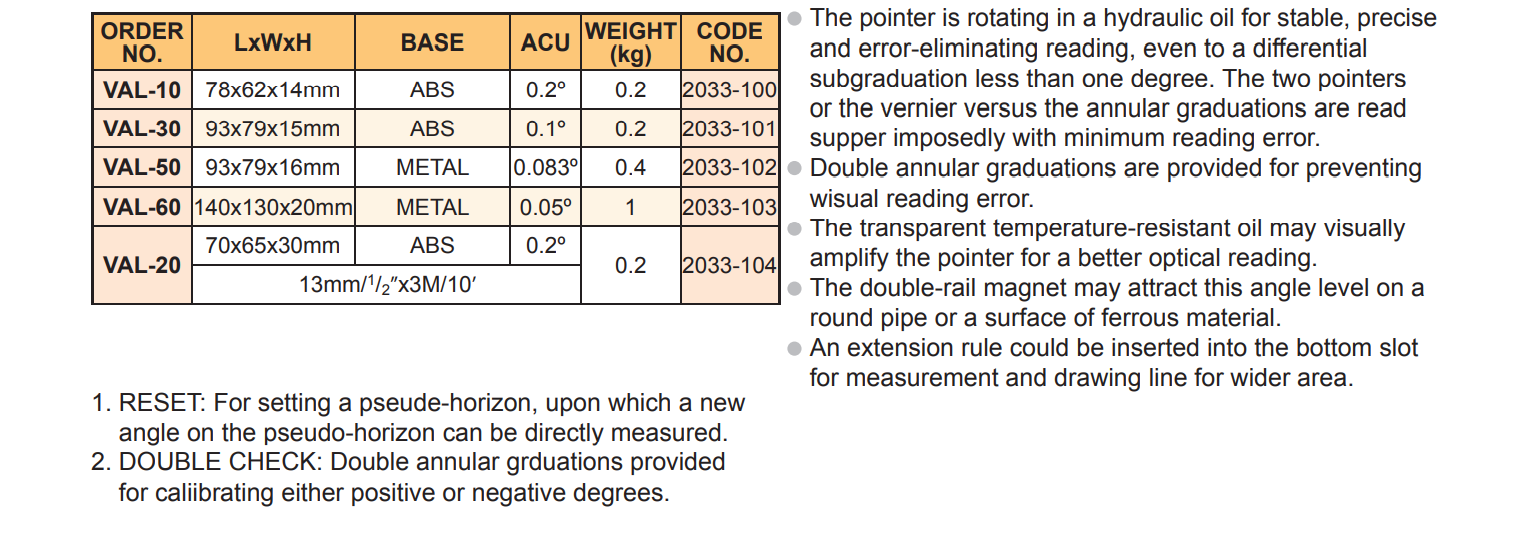– Li vô đo góc nghiêng VAL-10, VAL-30, VAL-50, VAL-60, VAL-20 của VERTEX được sử dụng để đo độ nghiêng của mặt phẳng chi tiết.