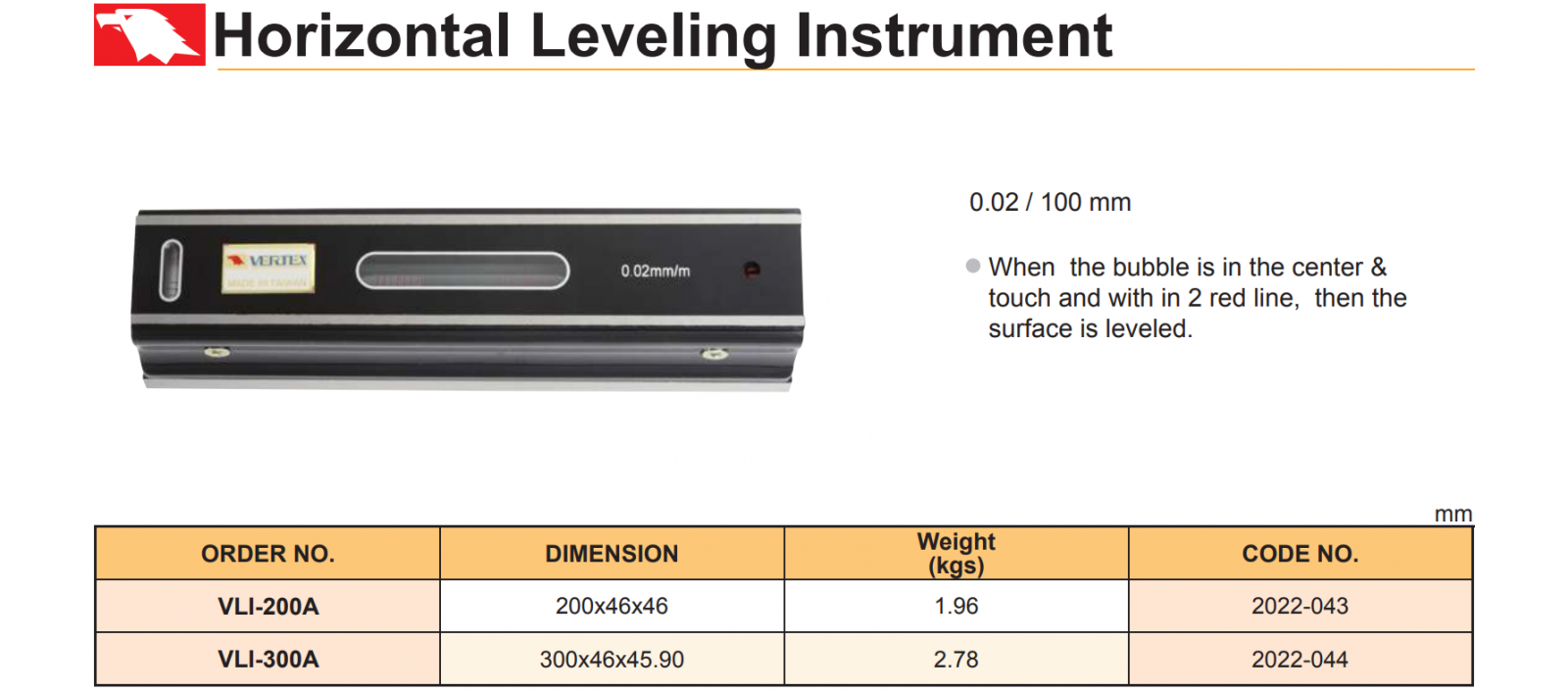 – Li vô ngang VLI-200A, VLI-300A của VERTEX được sử dụng để kiểm tra và điều chỉnh mặt phẳng chi tiết về mặt phẳng cân bằng nằm ngang.