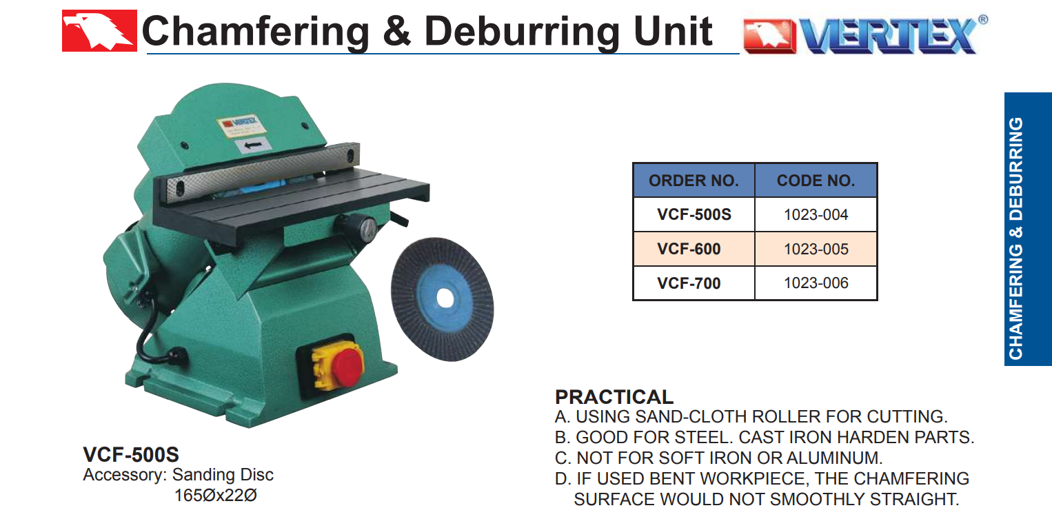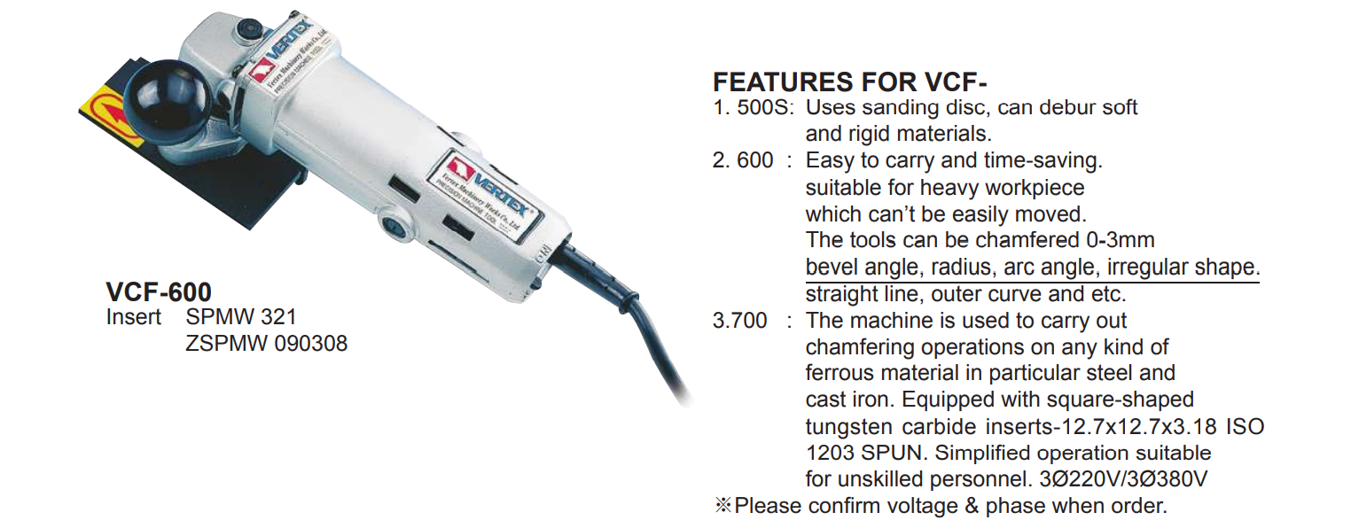 Máy vát mép cầm tay Vertex VCF-700 dùng để vát mép và mài ba via cho các loại phôi lớn, hoặc vát theo các cung tròn, vát theo góc, theo đường kính….