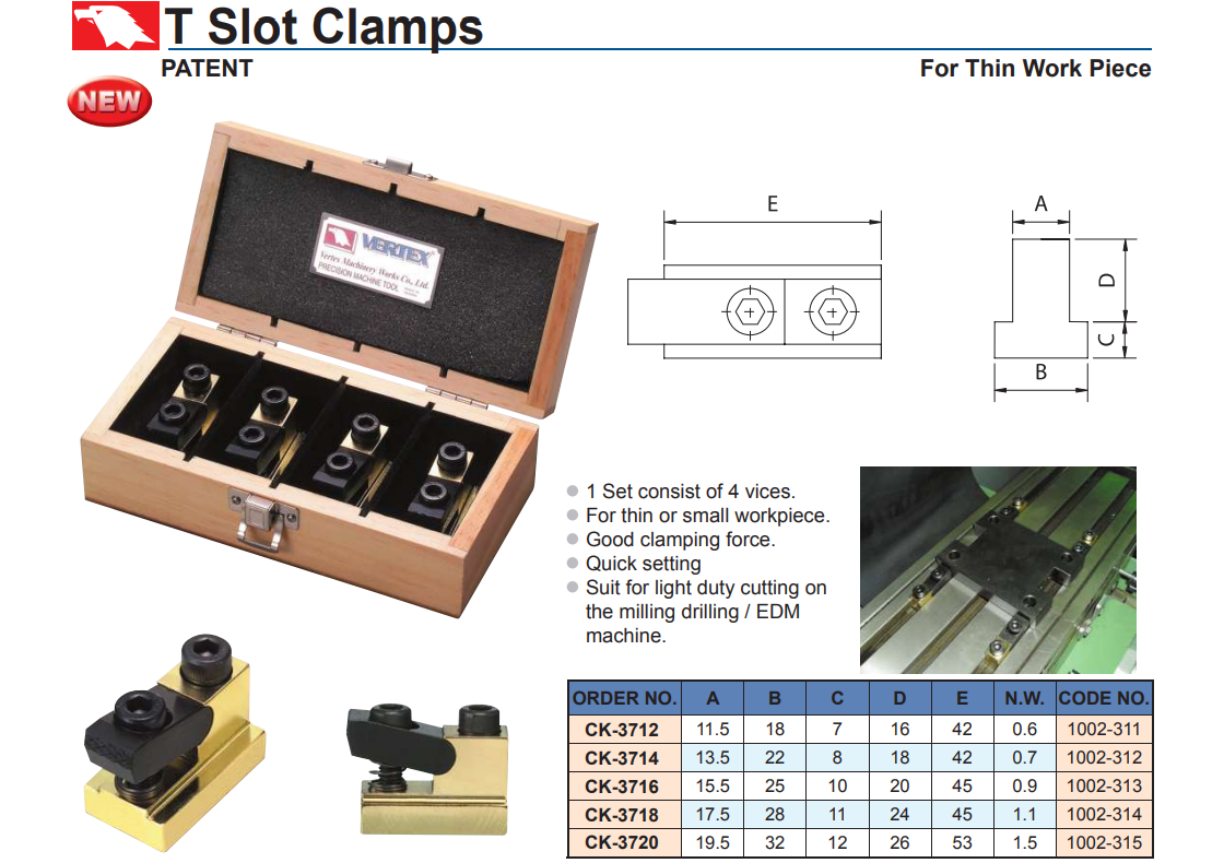 – Mỏ kẹp rãnh chữ T thích hợp cho gia công tải nhẹ trên máy phay, khoan và máy EDM.
