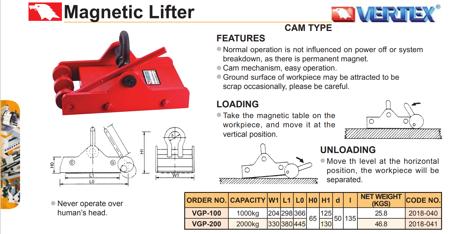 – Móc nâng hạ nam châm tay gạt VGP-100, VGP-200 của VERTEX sử dụng làm móc cẩu hút và nâng các chi tiết bằng sắt, thép có khối lượng lớn 1000Kg và 2000Kg bằng lực từ nam châm vĩnh cửu, mà không cần dây buộc và gây sầy xước chi tiết gia công trong phân xưởng.