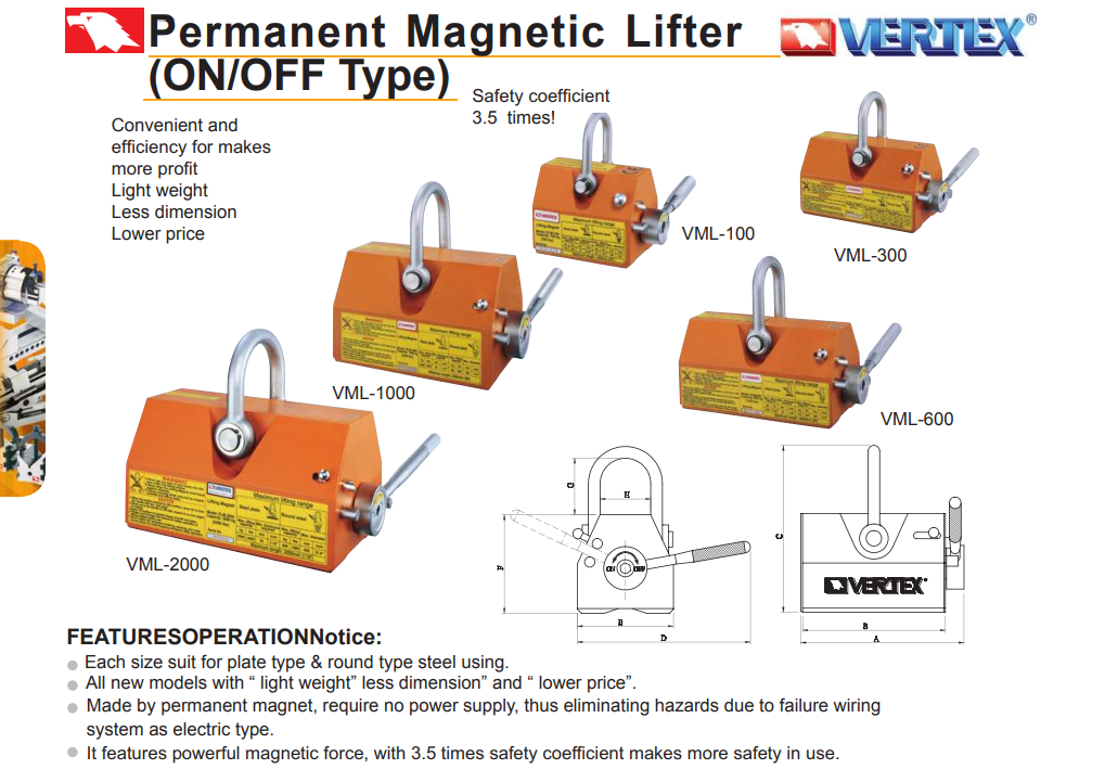 – Móc nâng hạ nam châm từ tính VML-100, VML-300, VML-600, VML-1000, VML-2000, VML-3TH của VERTEX sử dụng làm móc cẩu hút và nâng các chi tiết bằng sắt, thép có khối lượng lớn 100Kg ~ 3000Kg bằng lực từ nam châm vĩnh cửu, mà không cần dây buộc và gây sầy xước chi tiết gia công trong phân xưởng.