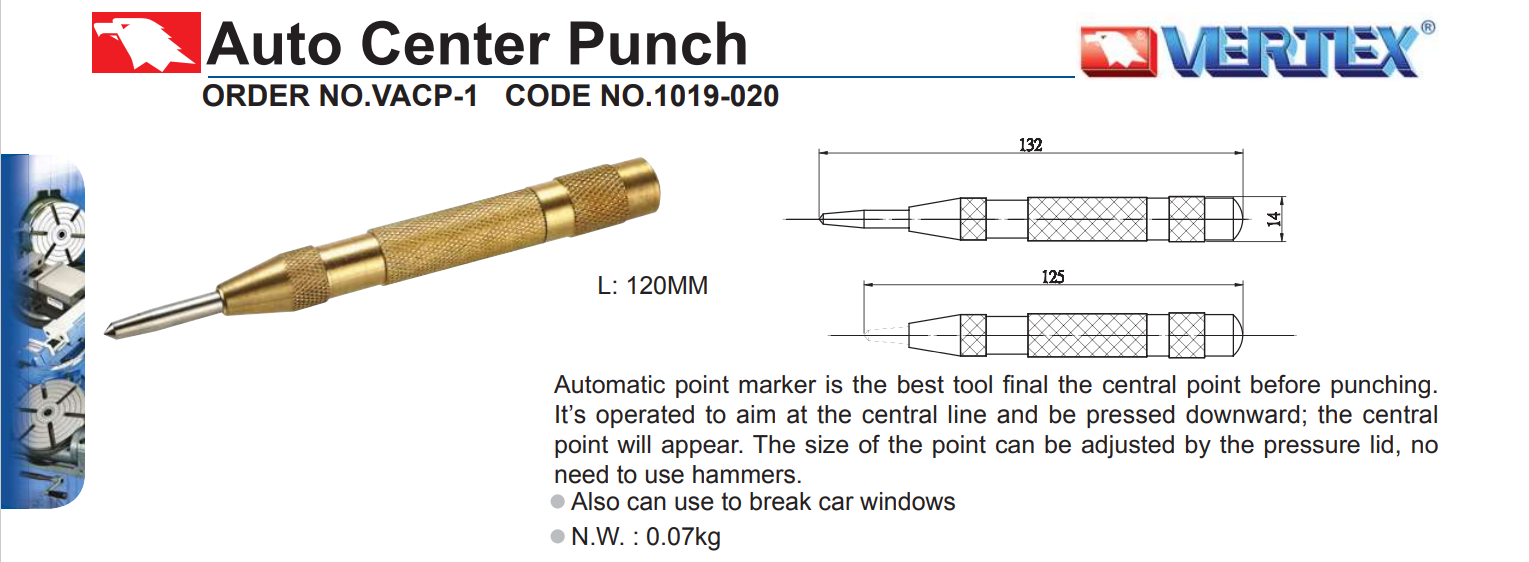 – Mũi lấy dấu tâm lỗ khoan tự động VACP-1 của VERTEX được sử dụng để đánh dấu các tâm lỗ trước khi khoan trên chi tiết.