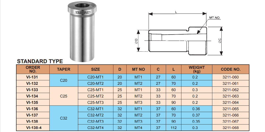 Ống kẹp nối chuyển từ C20, C25, C32 sang MT1, MT2, MT3, MT4: VI-131, VI-132, VI-133, VI-134, VI-135, VI-136, VI-137, VI-138, VI-138-4 của VERTEX sử dụng kẹp các bầu kẹp chuôi côn MT, mũi khoan chuôi côn, vào bầu kẹp collet trụ C20, C25, C32.