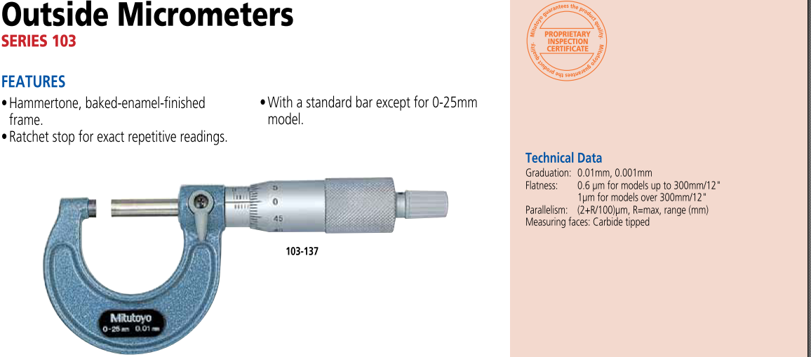 Mã hàng 103-137 là dụng cụ đo panme cơ khí đo ngoài khoảng đo từ 0-25mm/0.01mm