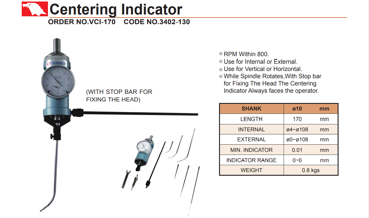 – Đồng hồ xác định tâm lỗ, trục tròn VCI-170 của VERTEX sử dụng xác định tâm lỗ hoặc tâm trục tròn có đường kính từ 0 – 108mm, trên máy phay, khoan,…