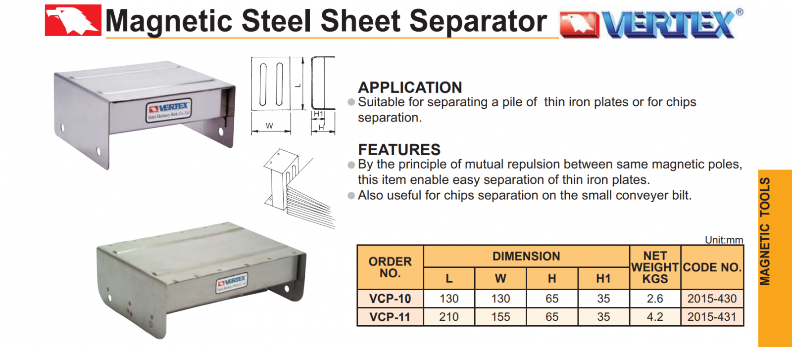 – Thiết bị tách tấm thép bằng từ tính VCP-10, VCP-11 của VERTEX dùng tách tạo khe hở cho các tấm thép mỏng xếp chồng lên nhau hoặc tách các phoi xếp chồng đống lên nhau.