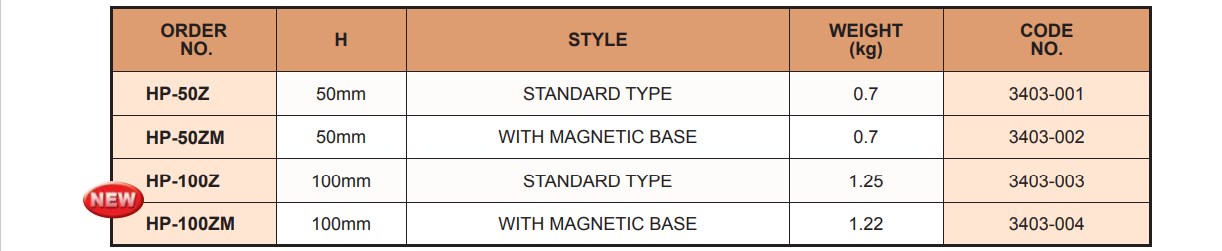 – Loại HP-50Z, HP-100Z không có đế từ, loại HP-50ZM, HP-100ZM có đế từ.