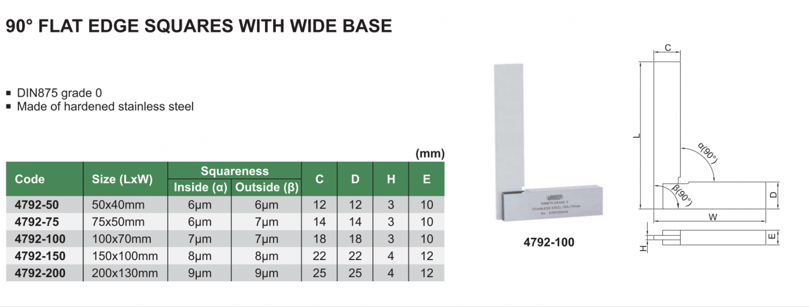 Thước đo góc INSIZE 4792-100 , 90 độ FLAT EDGE SQUARES WITH WIDE BASE 4792-100